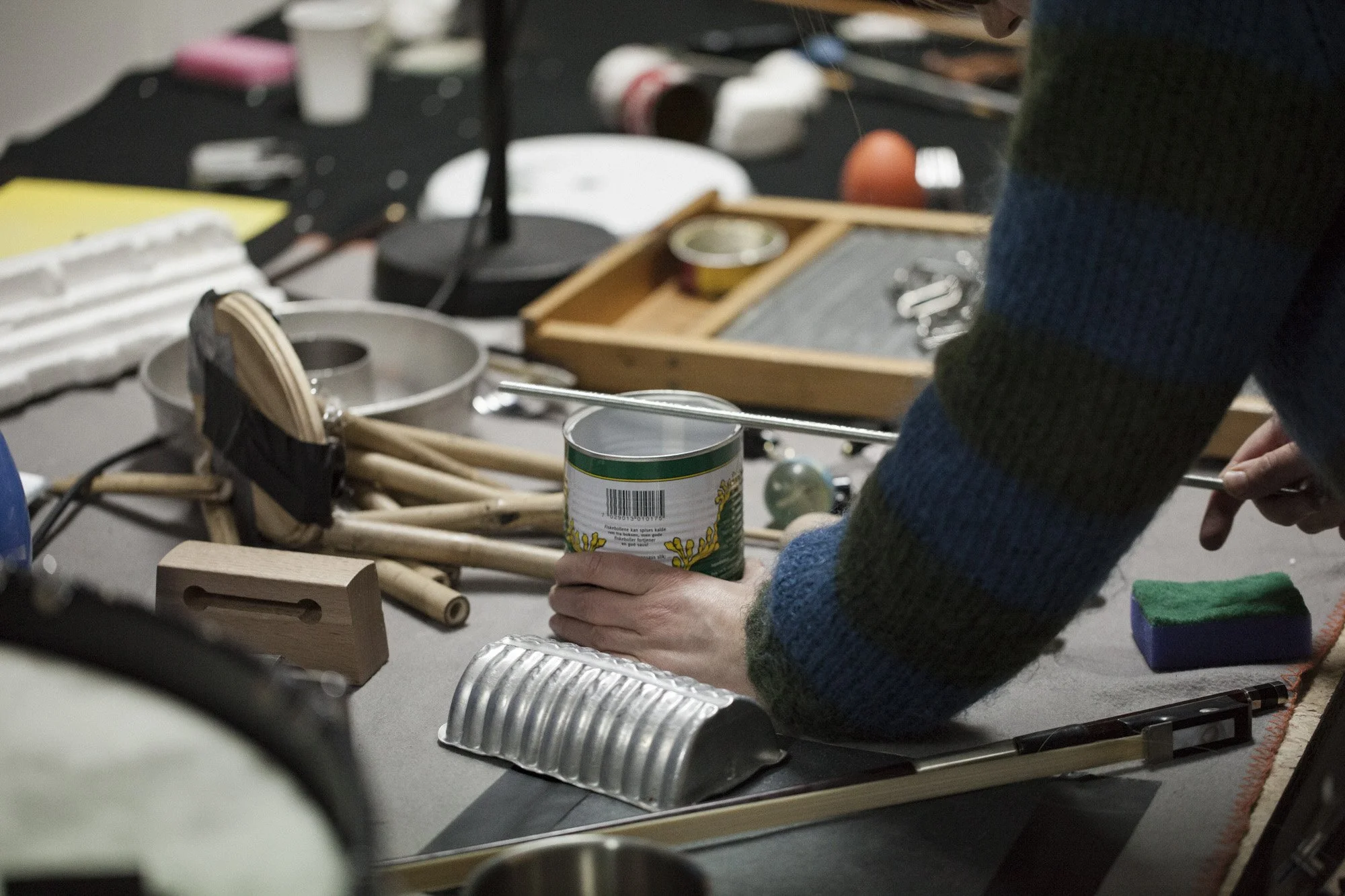 A series of videos show everyday objects being knocked, scraped, and drummed on. Chains and bells are thrown and dropped on potlids and other surfaces. Resonating tones occur when a plastic ball is pressed against the edge of a porcelain dish. Sandpaper rubs against wood resulting in crackling sounds. Dozens of everyday objects are spread about on a table and filmed from above, in clear reference to the chaotic set-ups often seen during performances of electronic noise music.